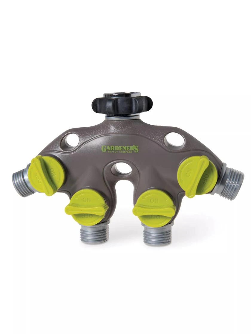 Connect up to four hoses to a single tap so you can run sprinklers, soaker hoses and drip irrigation, without running back and forth to swap out hoses. Or keep one spigot available for filling your watering can or rinsing hands. The angled spigots make connecting and disconnecting fittings a breeze. Separate dials smoothly control flow and on/off.